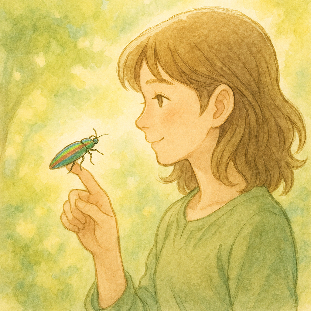 私の指先に、虹色の翅をもつタマムシがとまったのです。