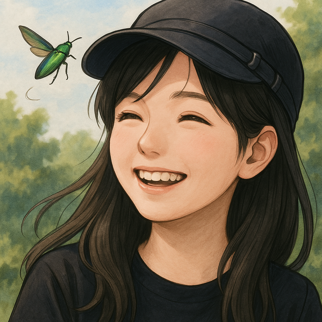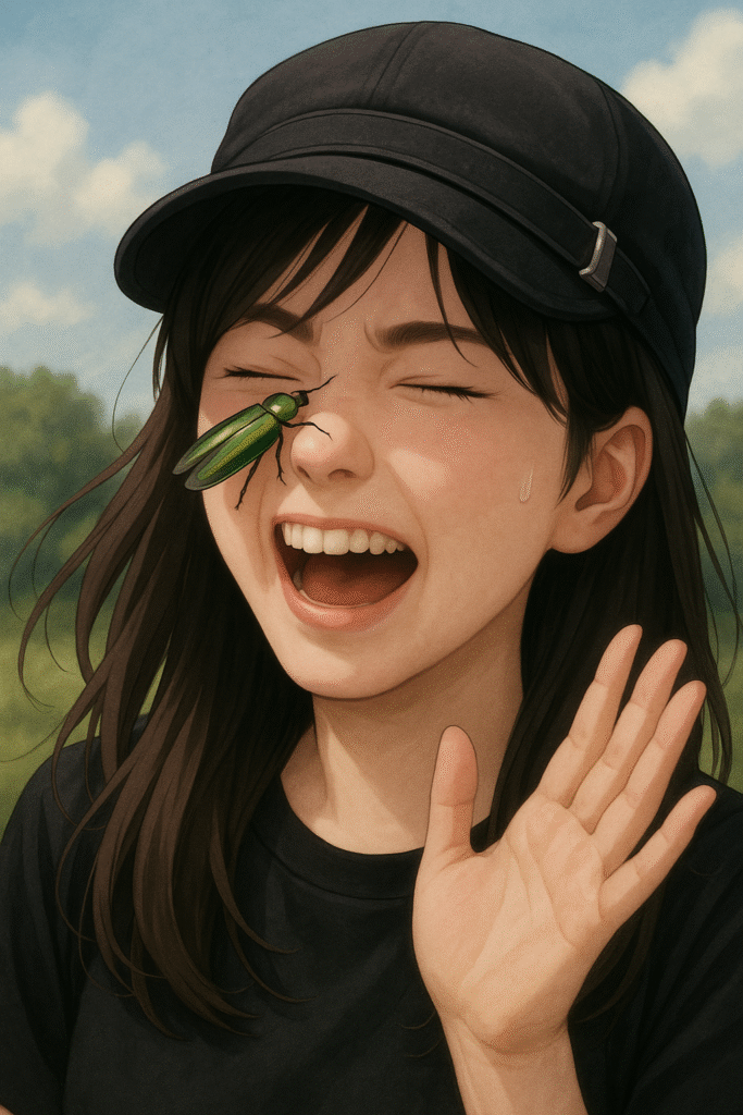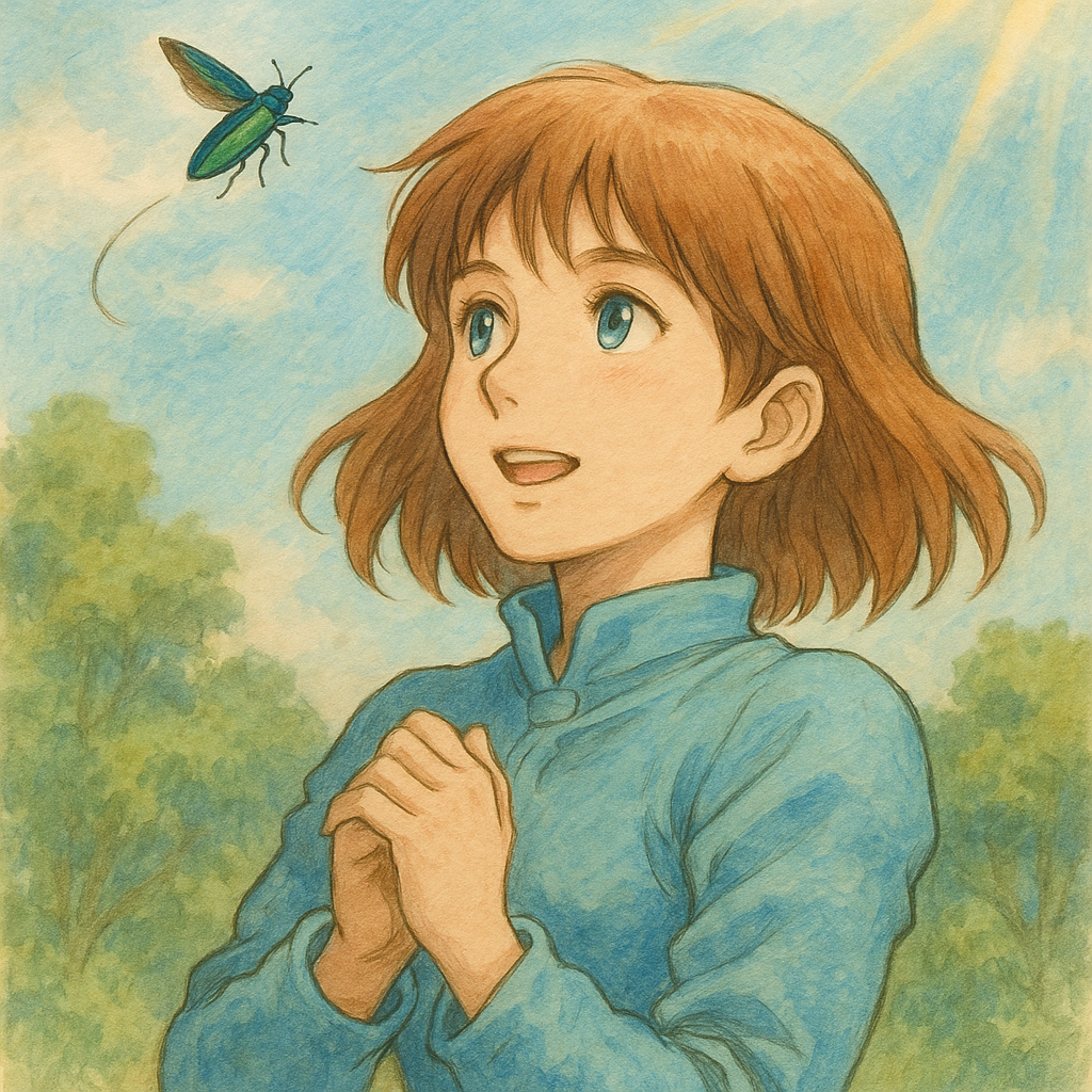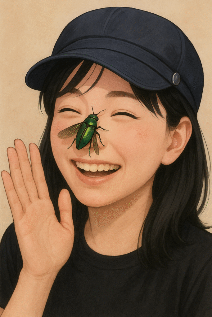 翅が震えたと思った次の瞬間、タマムシは私の頬をかすめて空へと舞い上がりました。