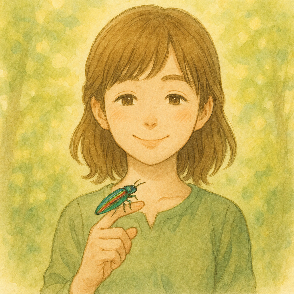 私の指先に、虹色の翅をもつタマムシがとまったのです。